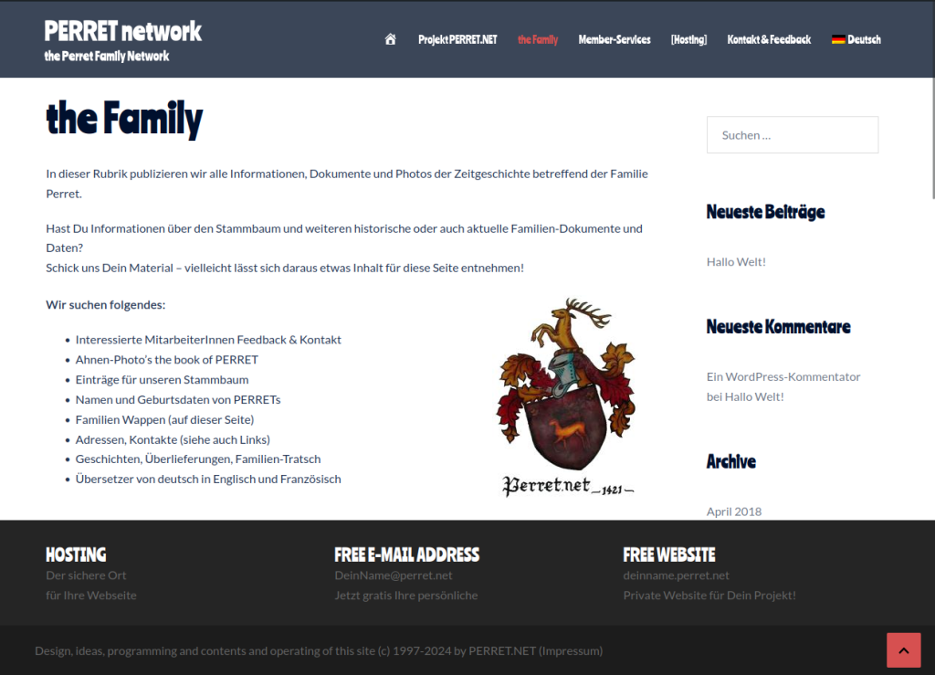 Perret.net ist ein Online-Angebot welches allen PERRET Familien-Mitgliedern Internet-Dienstleistungen zur Verfügung stellt. Wir möchten mit diesem Angebot allen die Möglichkeit geben, kostenlos eine Emailadresse und Webseite, mit eindeutiger und persönlicher Adresse, zu betreiben – und das lebenslang. Es sollen Informationen über die Geschichte und über Vorfahren und natürlich auch den lebenden Perret’s ausgetauscht und gesammelt werden können. Es sollen Systeme (auch als geschlossene Benutzergruppe) zur Verfügung gestellt werden, welche den Bedürfnissen entsprechen. Mitwirken darf jeder der interessiert ist und etwas beitragen kann und möchte.